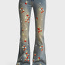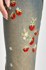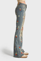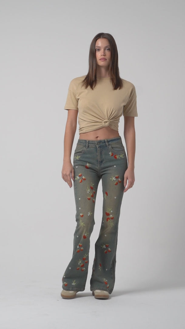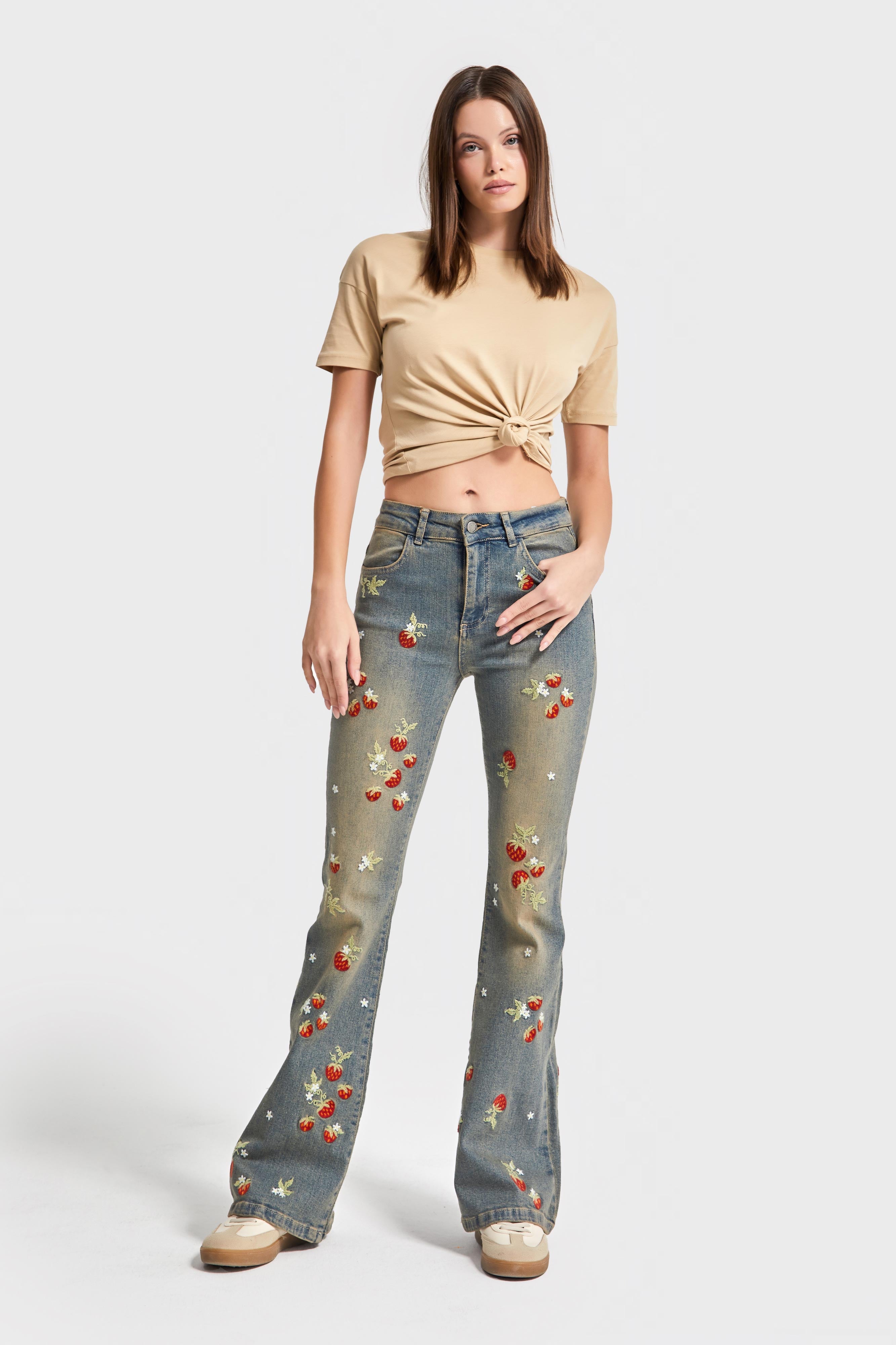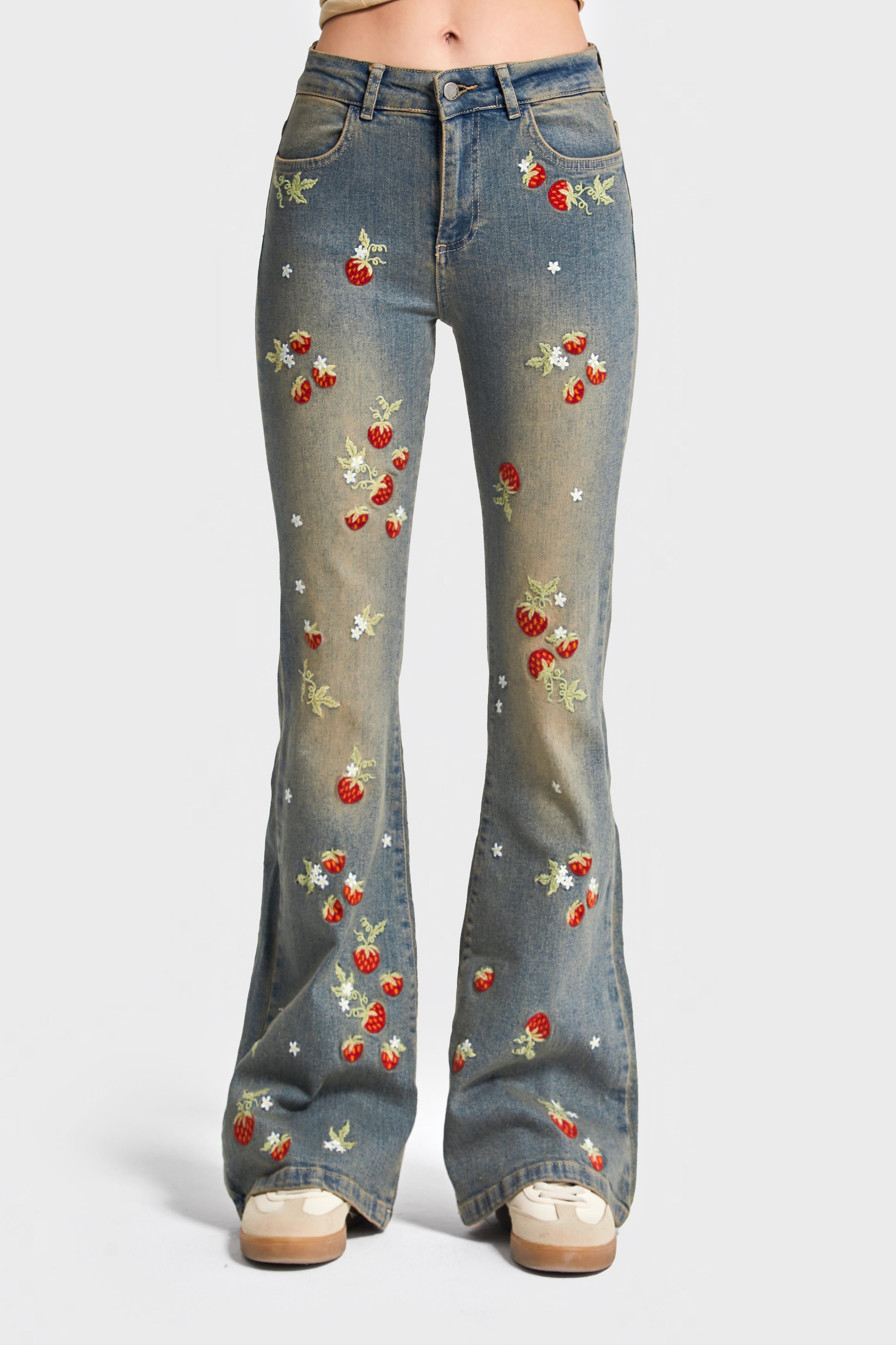 Deze flared jeans hebben een middelhoge taille en uitlopende pijpen tot aan de enkels. Verfraaid met delicate bloemen- en aardbeienborduursels, geven ze een speelse charme aan een klassiek denim silhouet. Een vrouwelijk item, ontworpen voor moeiteloze elegantie voor elke dag.