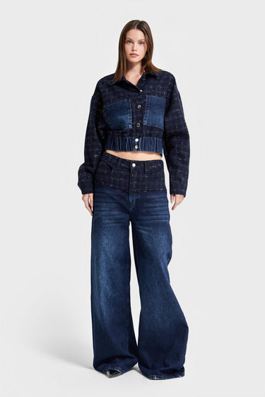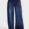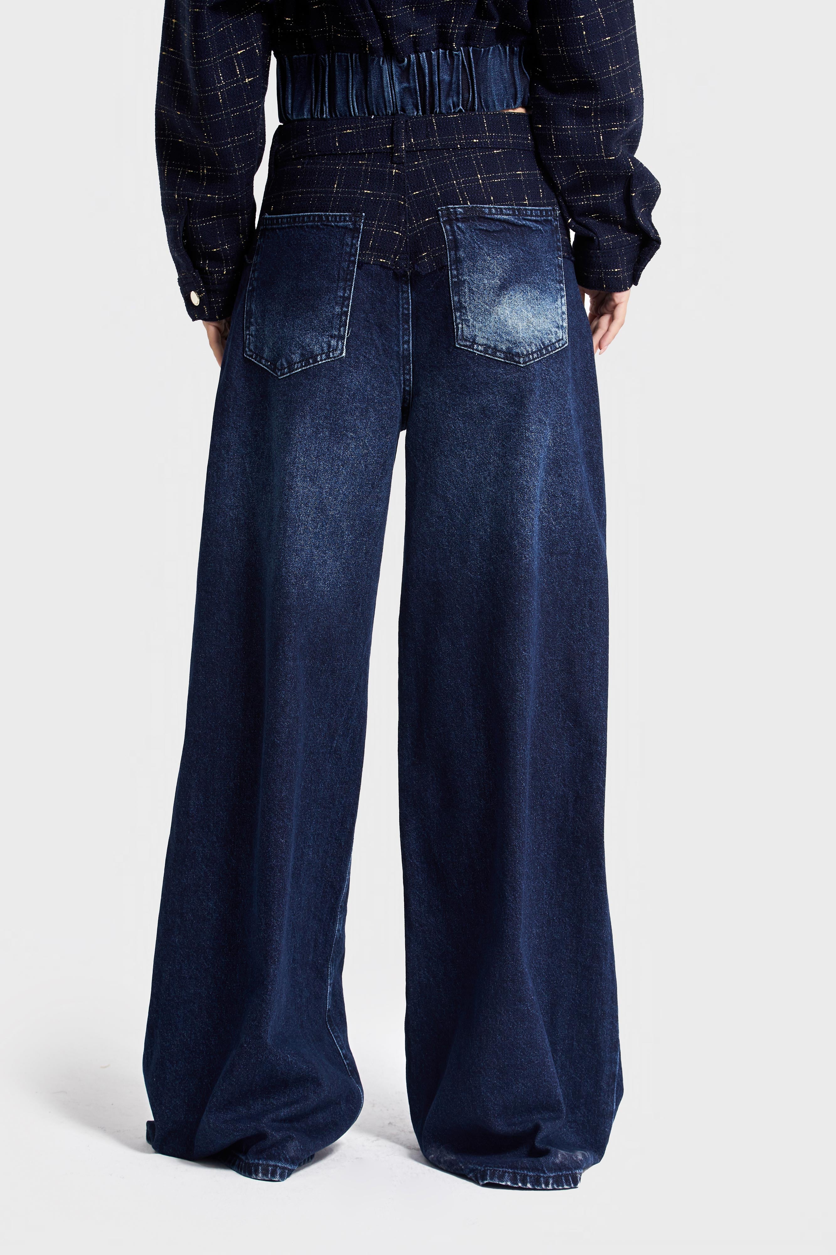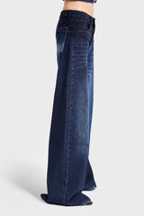 Deze palazzo fit denim heeft een middelhoge taille en wijde, vloeiende pijpen die een moeiteloos elegant silhouet creëren. De lange lengte zorgt voor een sierlijke beweging met behoud van structuur. Een gedecoreerde stijl die tijdloze denim subtiel onderscheidt.